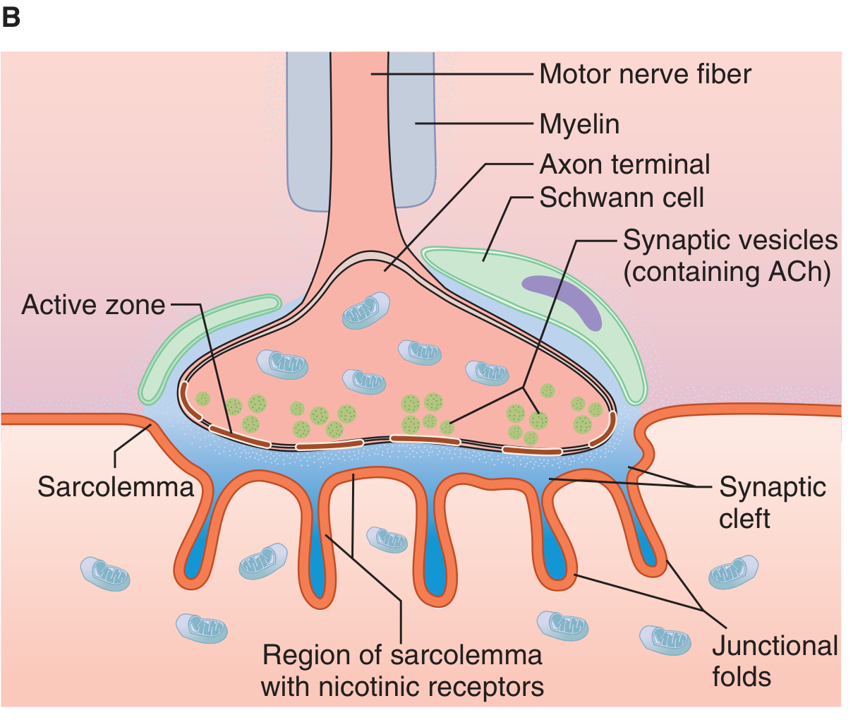 | Motor nerve terminal (presynaptic) | Unmyelinated terminal of the lower motor neuron; contains synaptic vesicles loaded with acetylcholine (ACh) |