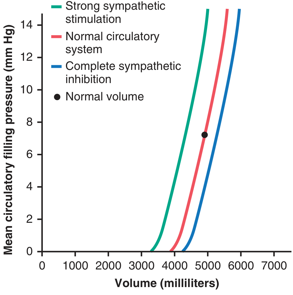 Normal blood volume (~5 L) → Psf = 7 mm Hg. Strong sympathetic stimulation doubles Psf to ~14 mm Hg.