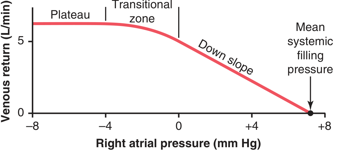 | Plateau | Very negative (< −4 mm Hg) | Large veins entering the chest collapse → venous return cannot increase further even as RAP falls |