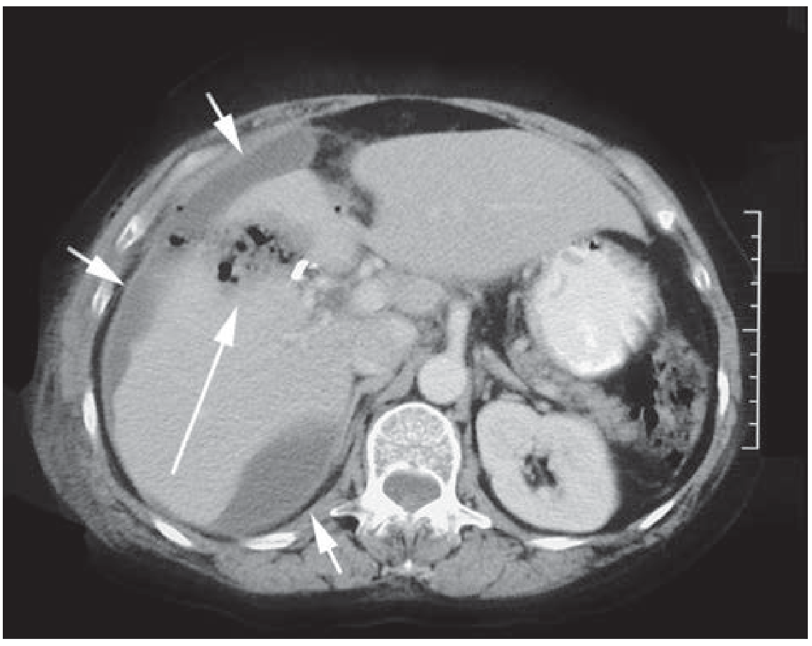 Figure A — CT abdomen: Short arrows indicate intraperitoneal fluid collections (biloma); the long arrow points to air and bile in the gallbladder bed, along with a surgical clip. This is the classic post-cholecystectomy bile leak appearance.