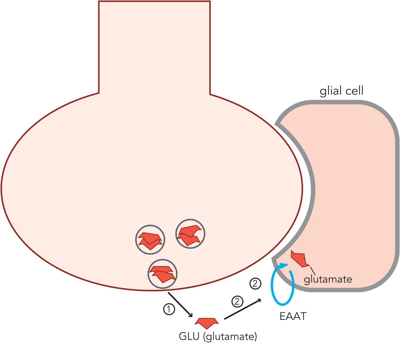 Glutamate released from the presynaptic terminal (1) is taken up into glial cells via EAAT (2) — Stahl's Essential Psychopharmacology