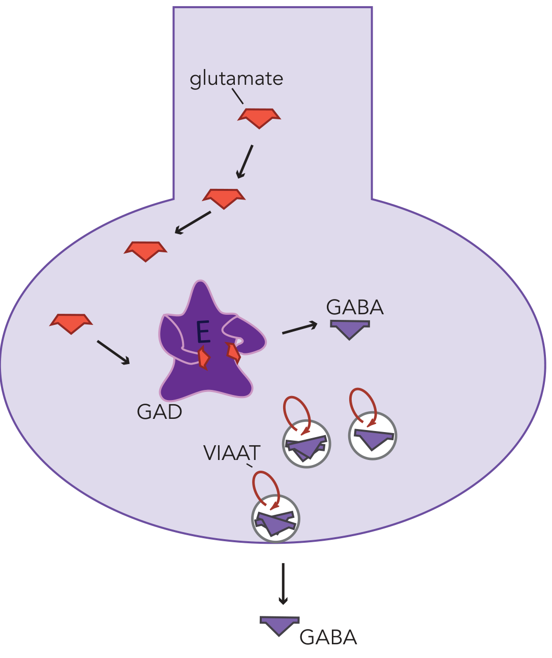 GABA is synthesized from glutamate by the enzyme glutamic acid decarboxylase (GAD) — requiring pyridoxal phosphate (vitamin B6) as cofactor. After synthesis, GABA is packaged into vesicles by vesicular inhibitory amino acid transporters (VIAATs) and released.