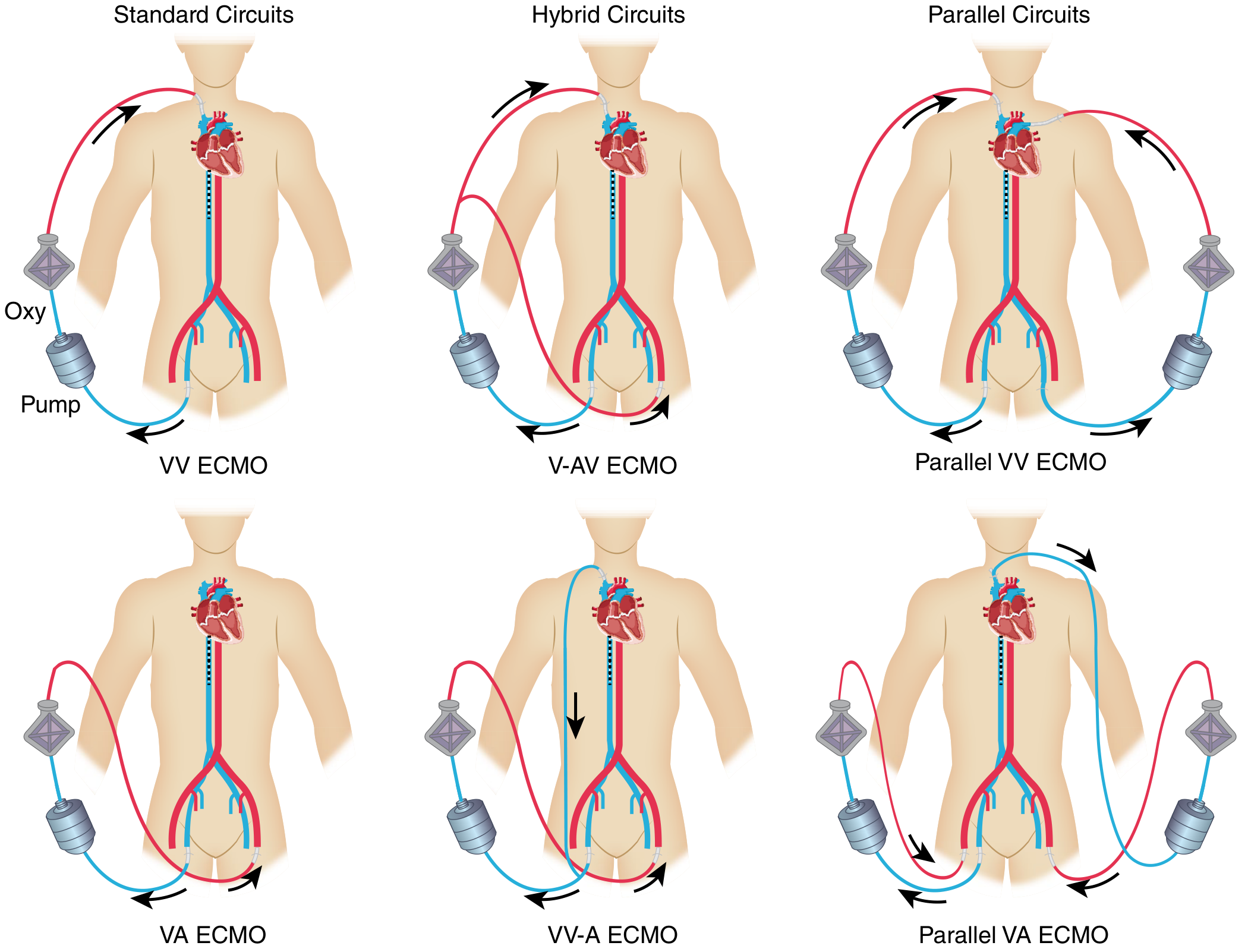 | V-AV ECMO | Veno-arteriovenous | Hybrid; flexible transitions between circulatory and respiratory support |