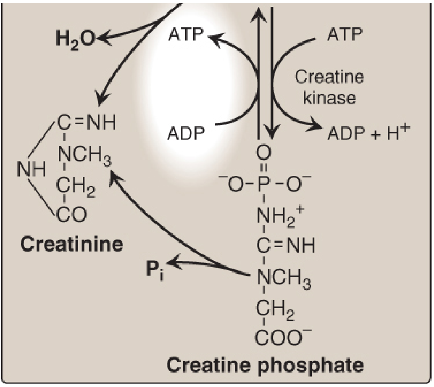 Creatine phosphate → Creatinine + Inorganic phosphate (Pᵢ) + H₂O