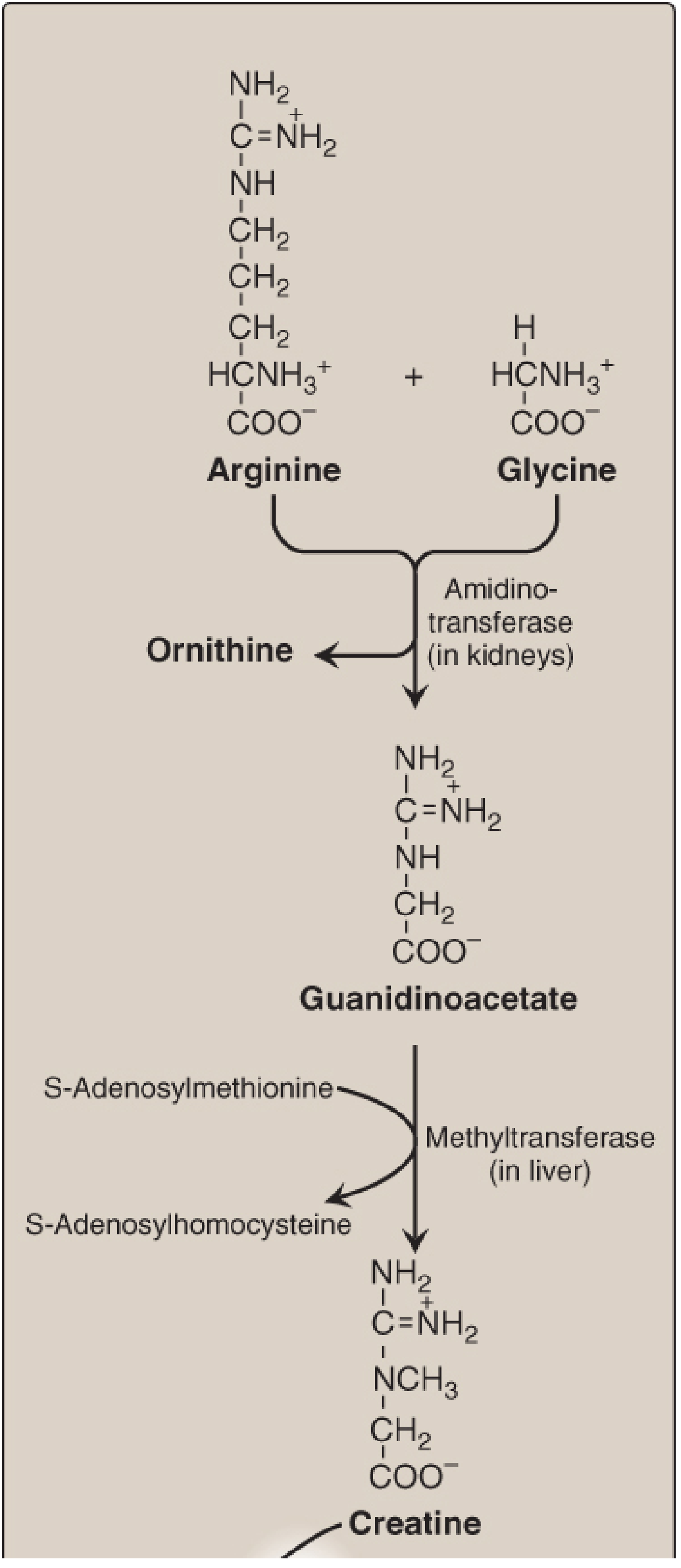 Arginine + Glycine →[Kidneys]→ Guanidinoacetate
