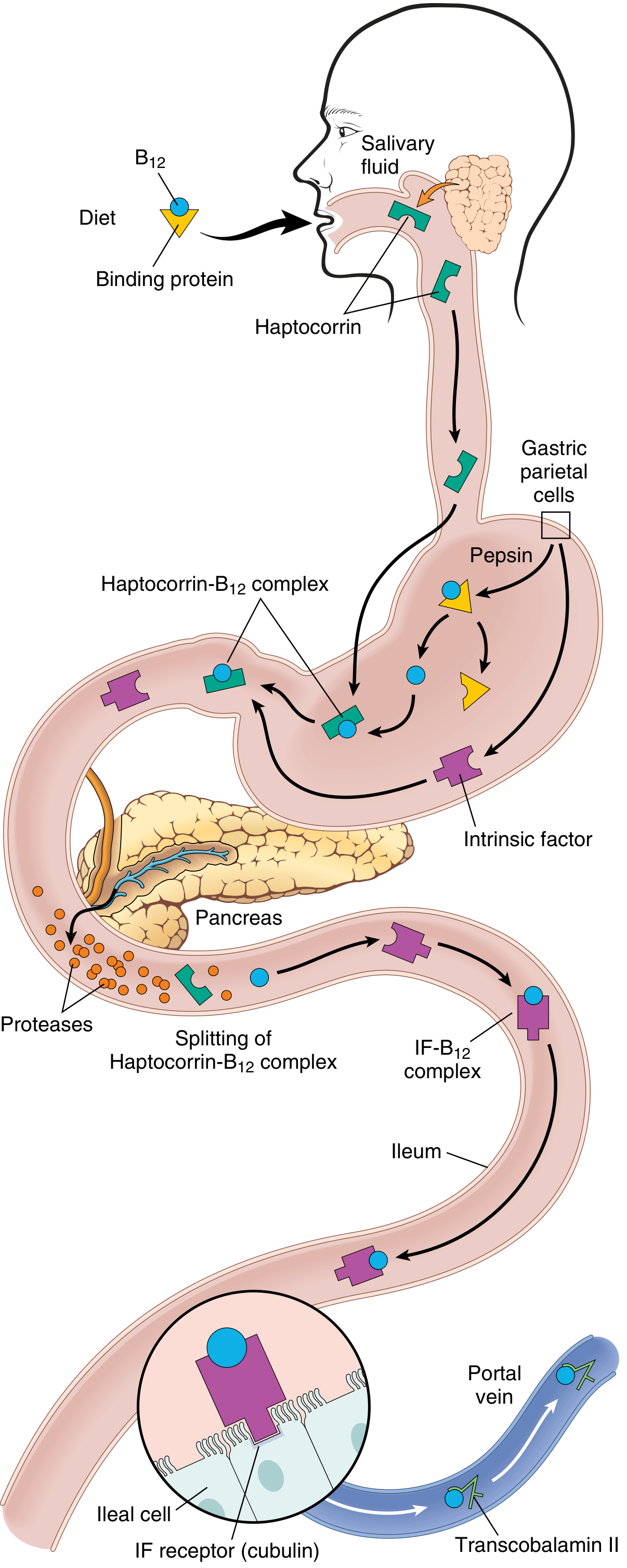 Vitamin B12 absorption. Dietary B12 → freed by pepsin → binds haptocorrin (saliva) → released by pancreatic proteases → binds intrinsic factor (IF, from gastric parietal cells) → IF-B12 complex absorbed in ileum via cubilin receptor → transported by transcobalamin II to liver and bone marrow. — Robbins & Kumar Basic Pathology