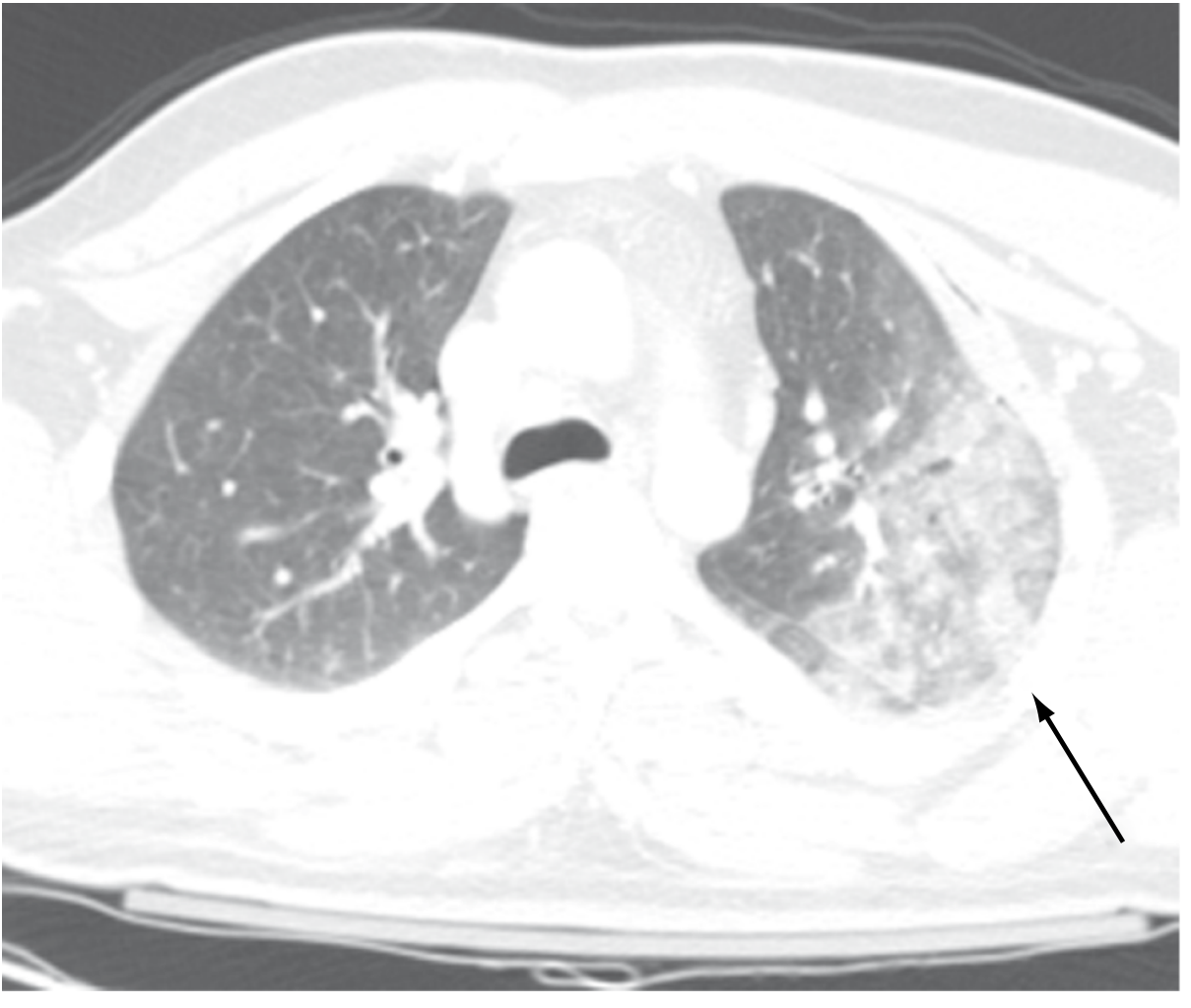 Left pulmonary contusion on CT — higher-density tissue from air-space hemorrhage — Sabiston Textbook of Surgery