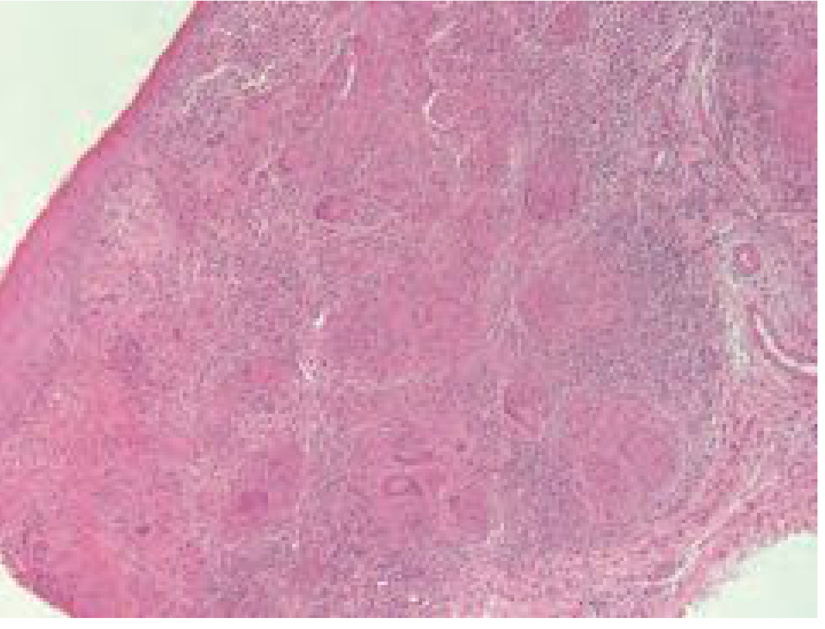 H&E stain of laryngeal tuberculosis showing granuloma formation — Cummings Otolaryngology