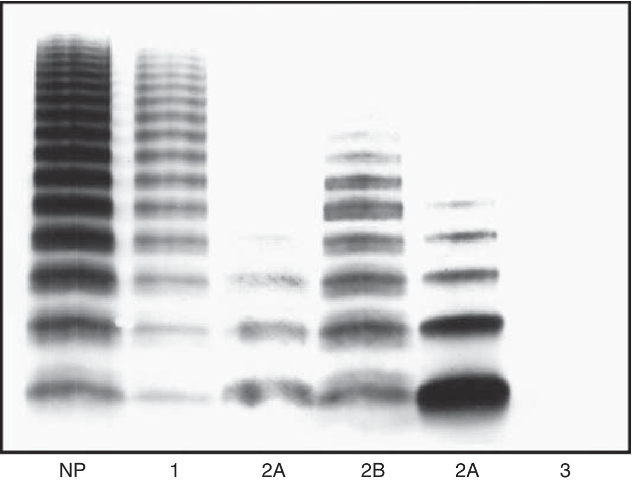 Fig: SDS-agarose gel of vWF multimers. Type 1 = reduced all bands; Type 2A/2B = loss of upper (HMW) bands; Type 3 = essentially absent. — Henry's Clinical Diagnosis, p. 979