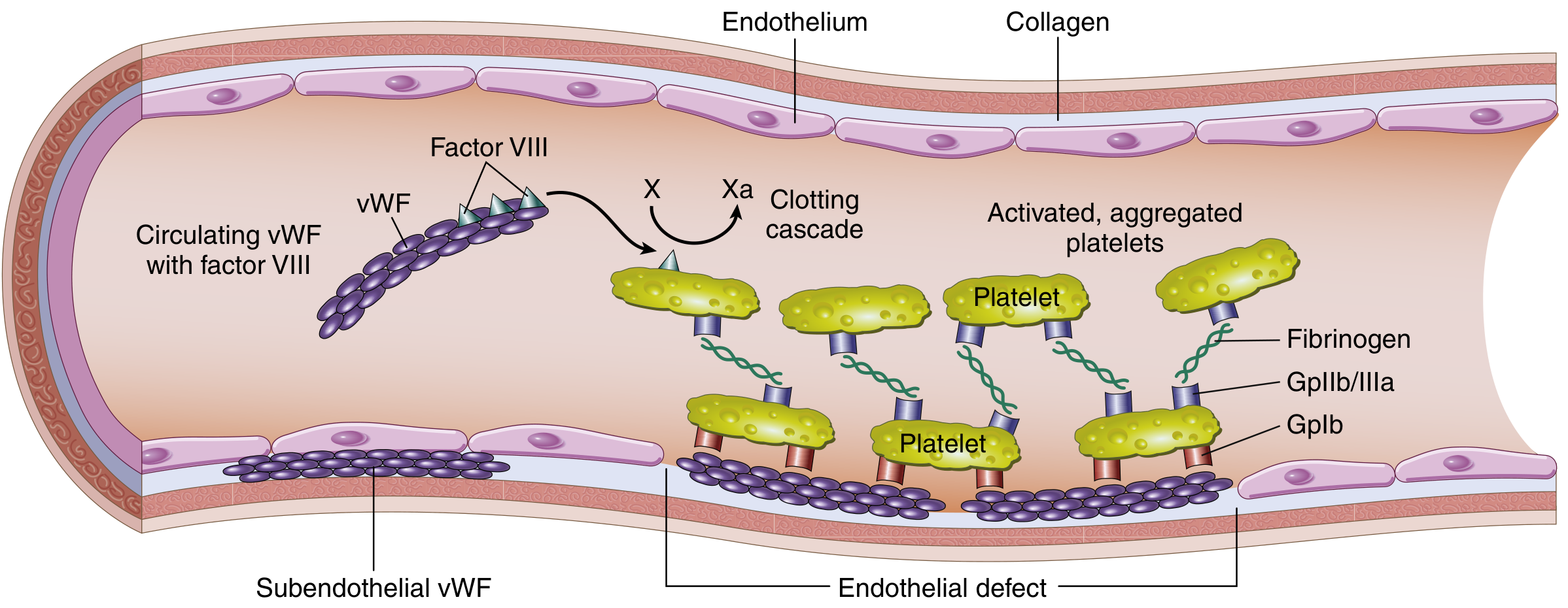 vWF bridge: Collagen ←→ vWF ←→ Platelet GpIb receptor