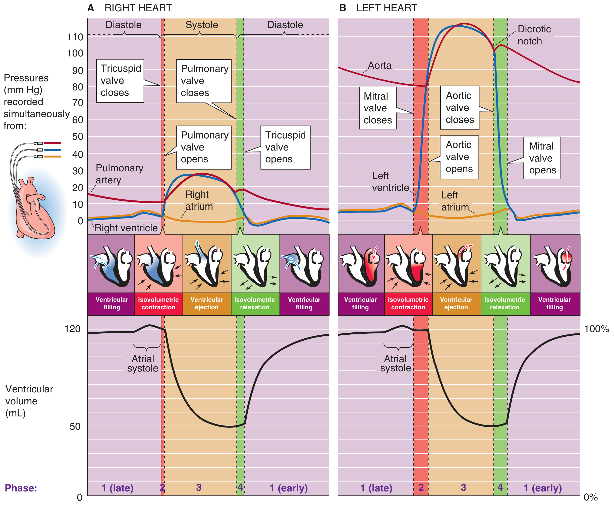 The right and left hearts go through the same four phases simultaneously, but at different pressure ranges: