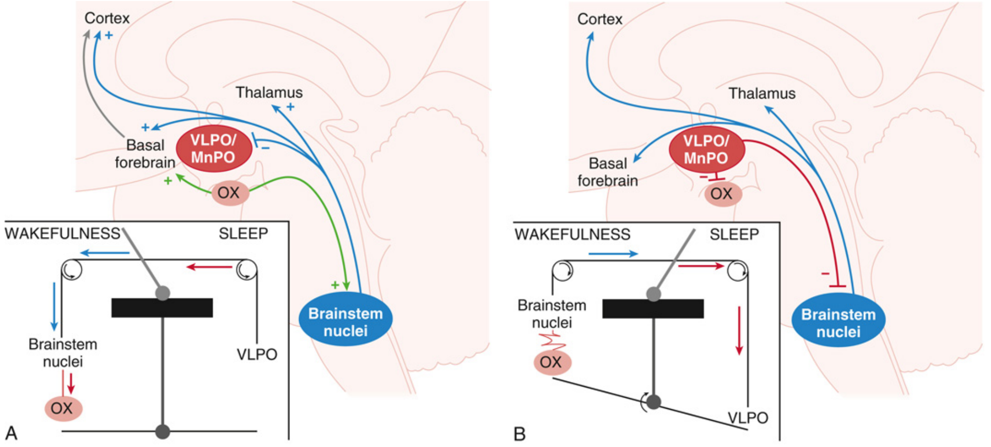 Figure: (A) During wakefulness, brainstem arousal nuclei activate the thalamus, basal forebrain, and cortex; orexin (OX) reinforces this. (B) During sleep, VLPO/MnPO neurons inhibit the arousal system and orexinergic neurons, flipping the switch to sleep.