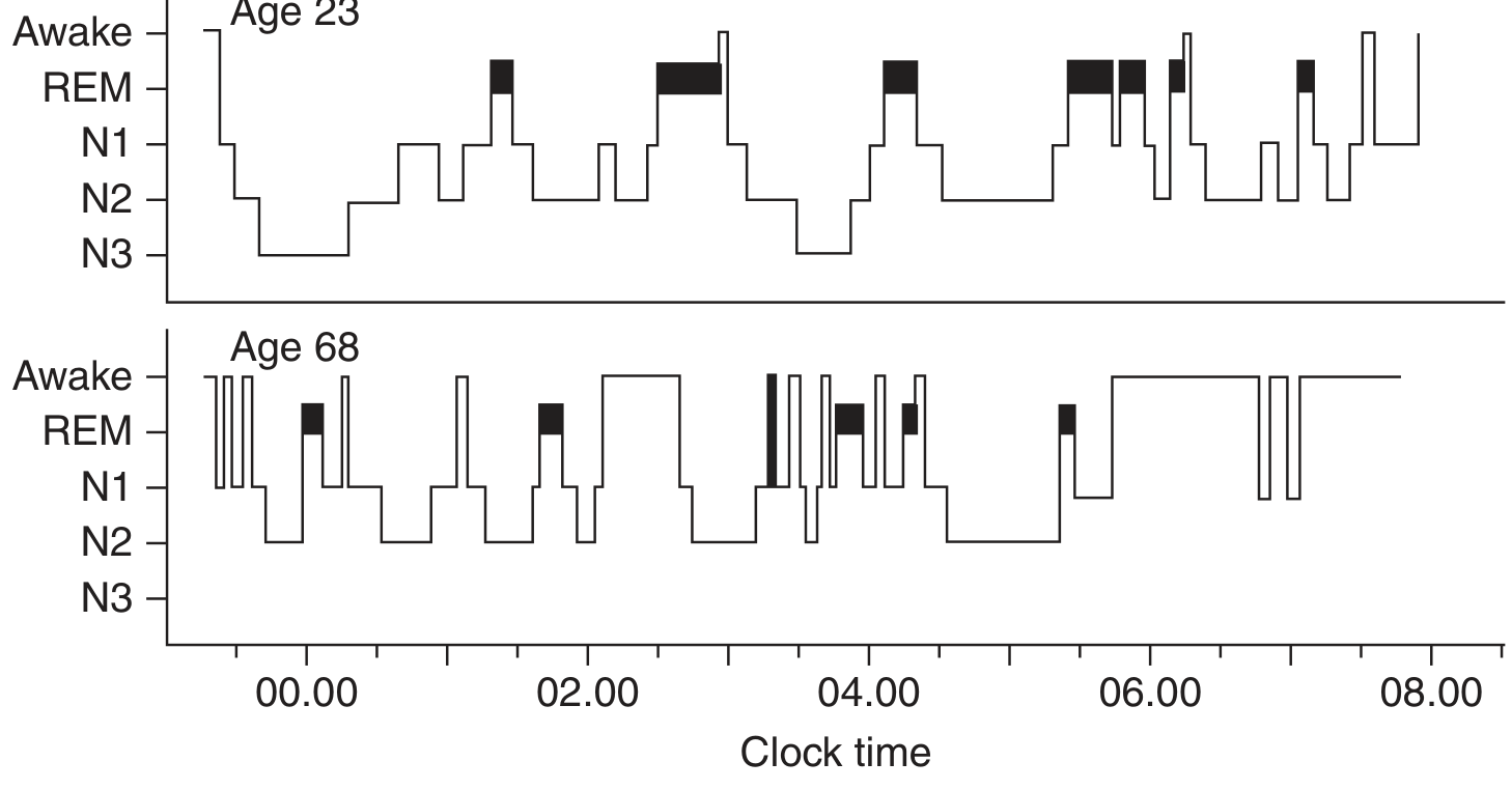 Figure: Sleep hypnogram showing NREM (N1–N3) and REM cycles across the night. Young adults show prominent N3 (slow-wave) sleep early in the night; REM sleep dominates the second half. Older adults show markedly reduced N3 and frequent awakenings.