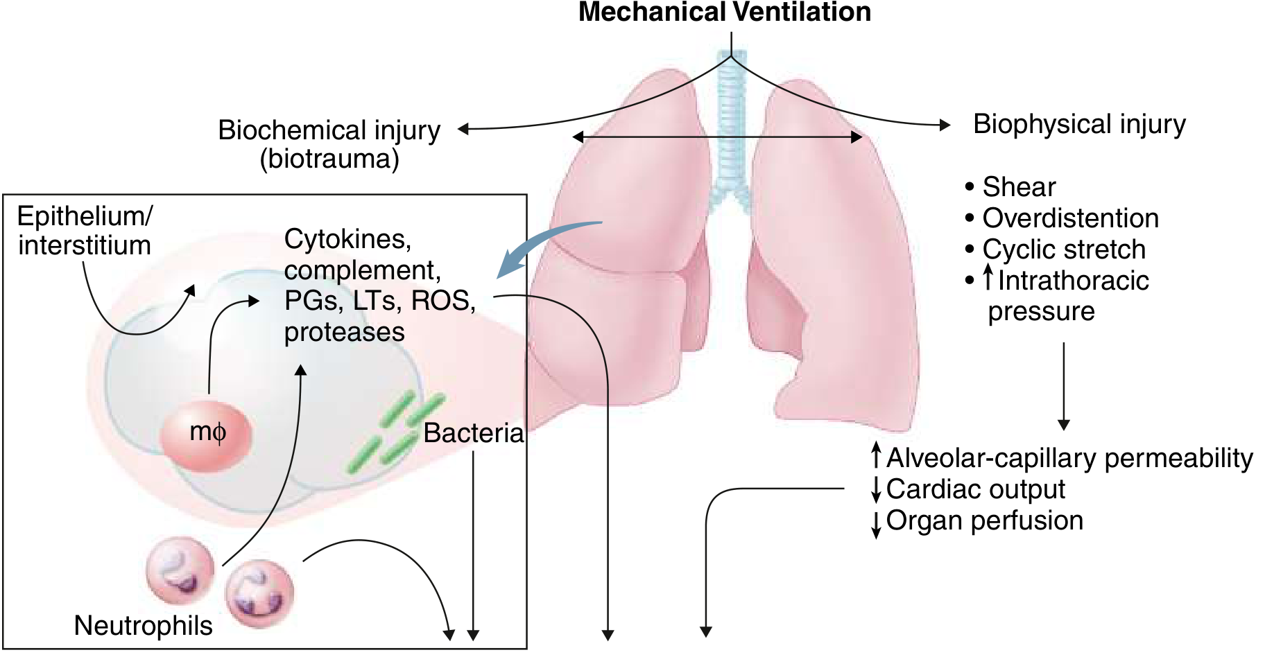 - Biotrauma: Mechanical stretch of the lung epithelium stimulates release of cytokines (TNF-α, IL-1β, IL-6, IL-8), prostaglandins, leukotrienes, ROS, and proteases into the systemic circulation — a likely driver of multi-organ failure