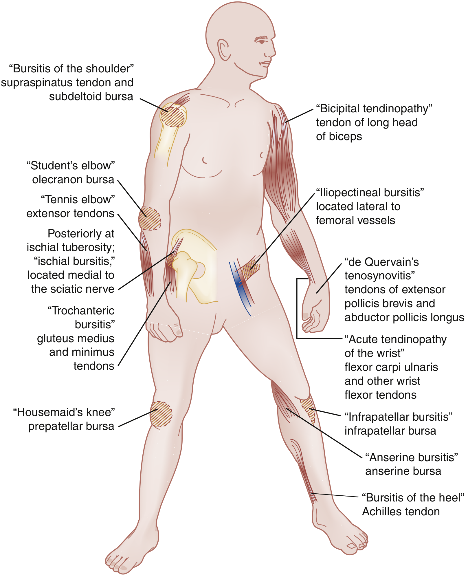 Common sites of tendinopathy and bursitis — note "Bursitis of the heel" at the Achilles tendon