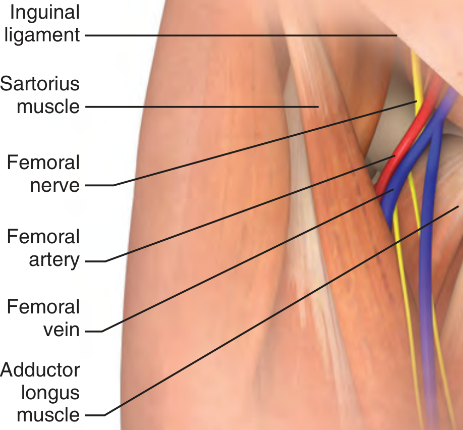 - Insert needle 1–2 cm medial to femoral pulse, 1–2 cm below the inguinal ligament