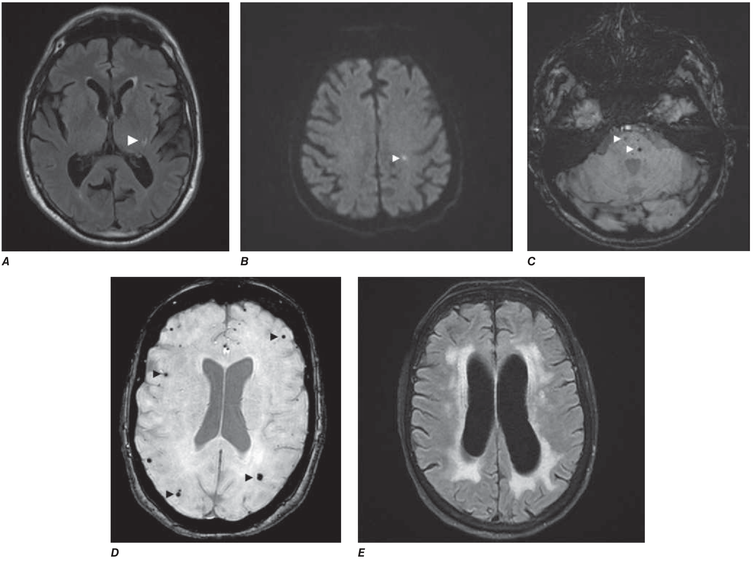 MRI markers of cerebral small vessel disease. A: Lacunar infarct (FLAIR, left thalamus). B: Acute microinfarct (DWI, centrum semiovale). E: Confluent white matter hyperintensities (FLAIR). — Harrison's Principles of Internal Medicine, 22E, Fig. 444-1