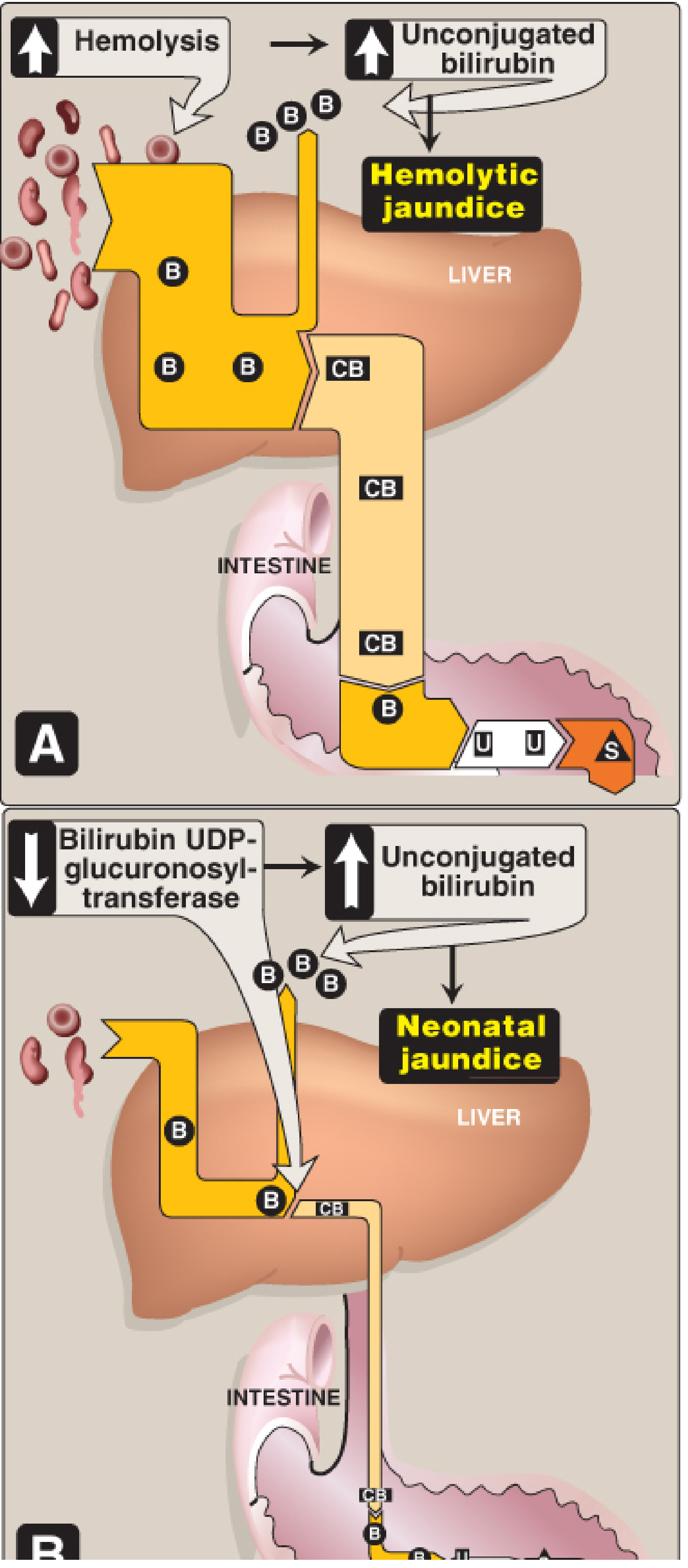 Figure 21.12A — Hemolytic jaundice. Increased hemolysis floods the liver with bilirubin (B), generating excess conjugated bilirubin (CB) and maximizing urobilinogen (U) and stercobilin (S). Only UCB is abnormally elevated. — Lippincott Biochemistry, 8th ed