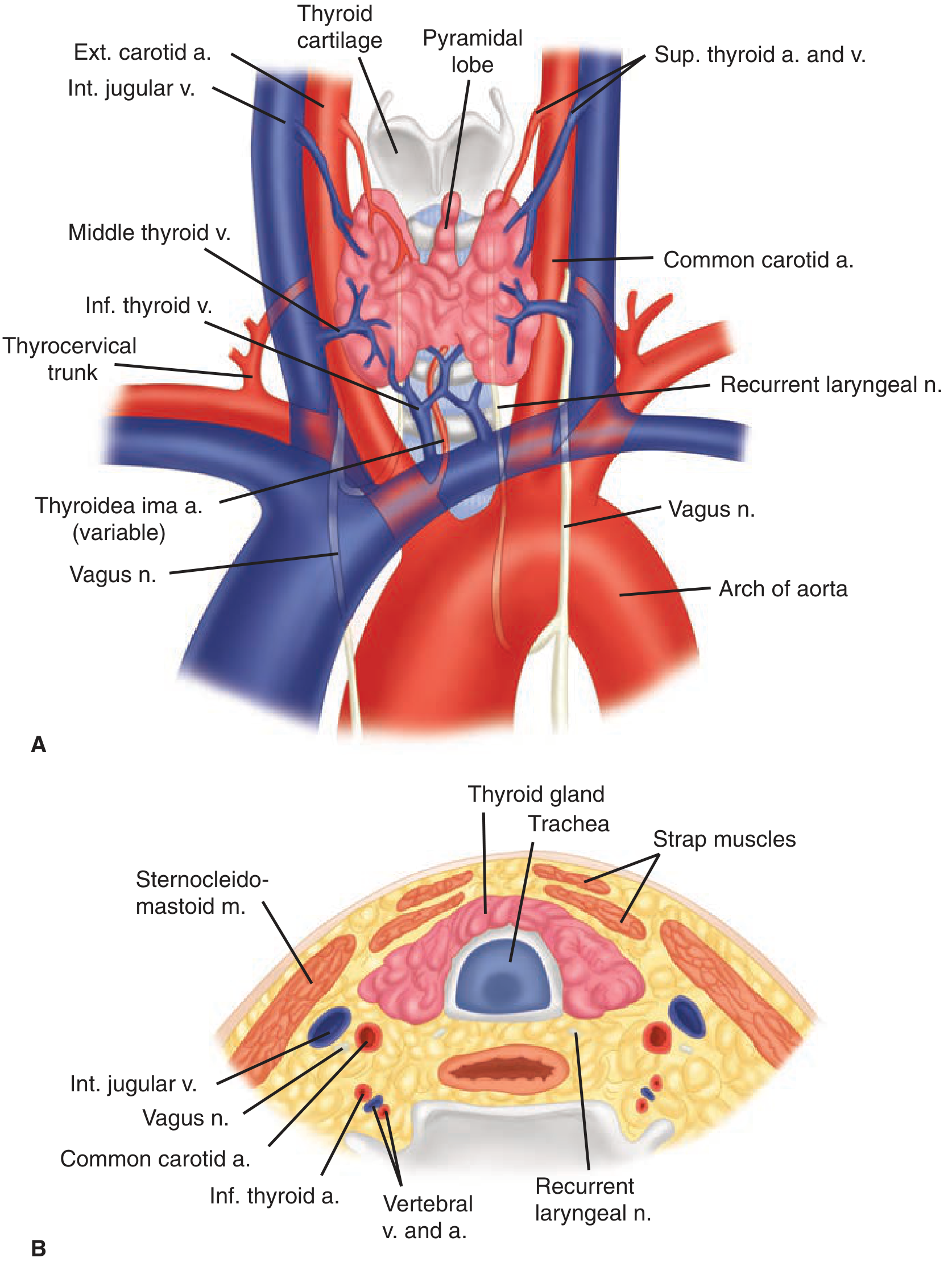 (Schwartz's Principles of Surgery, Fig. 38-2 — Thyroid anatomy anteriorly (A) and in cross-section (B))