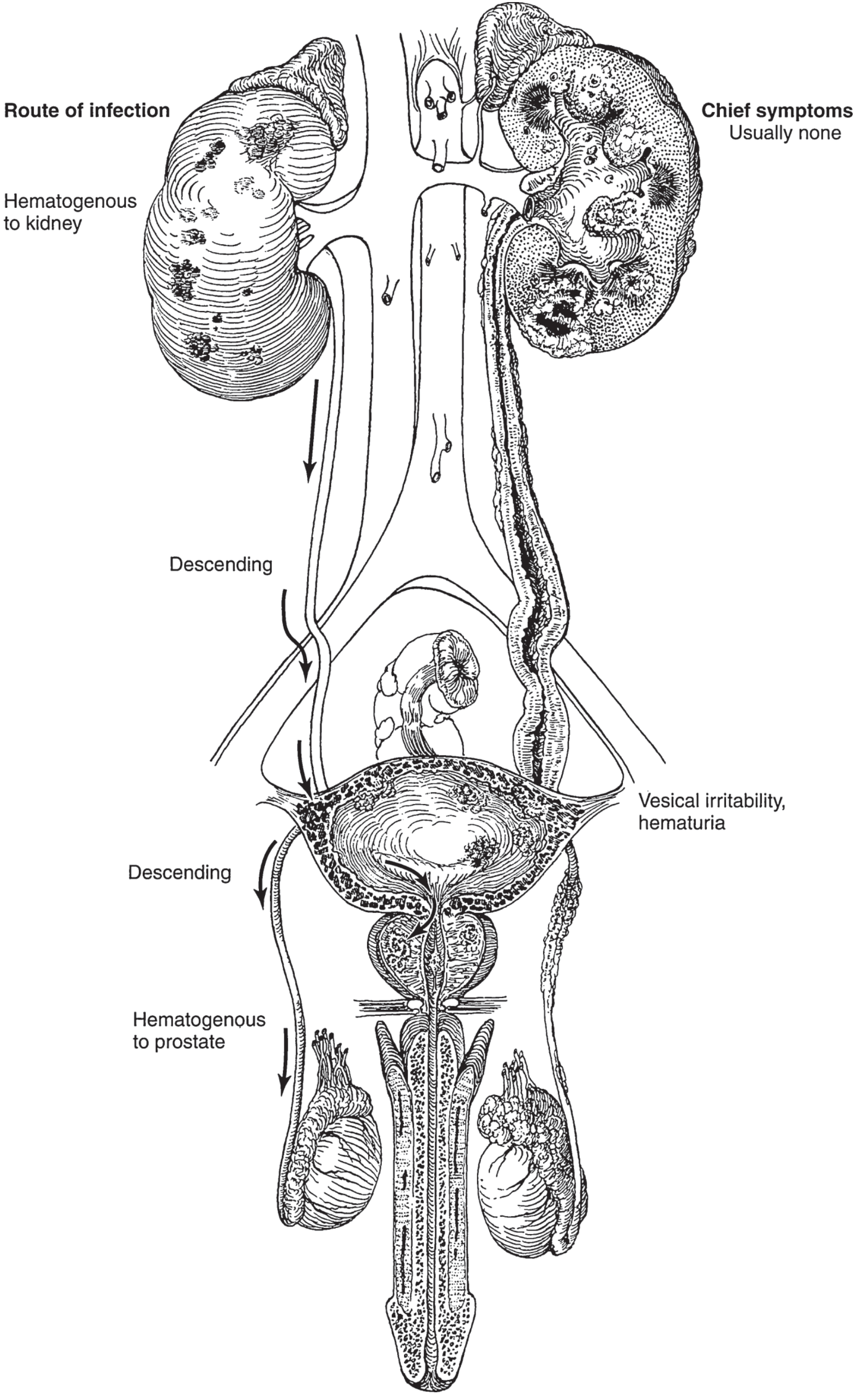 From the kidney, infection descends contiguously through urine to the collecting system → ureter → bladder → prostatic urethra → prostate/seminal vesicles → epididymis. The prostate can also be seeded directly haematogenously.