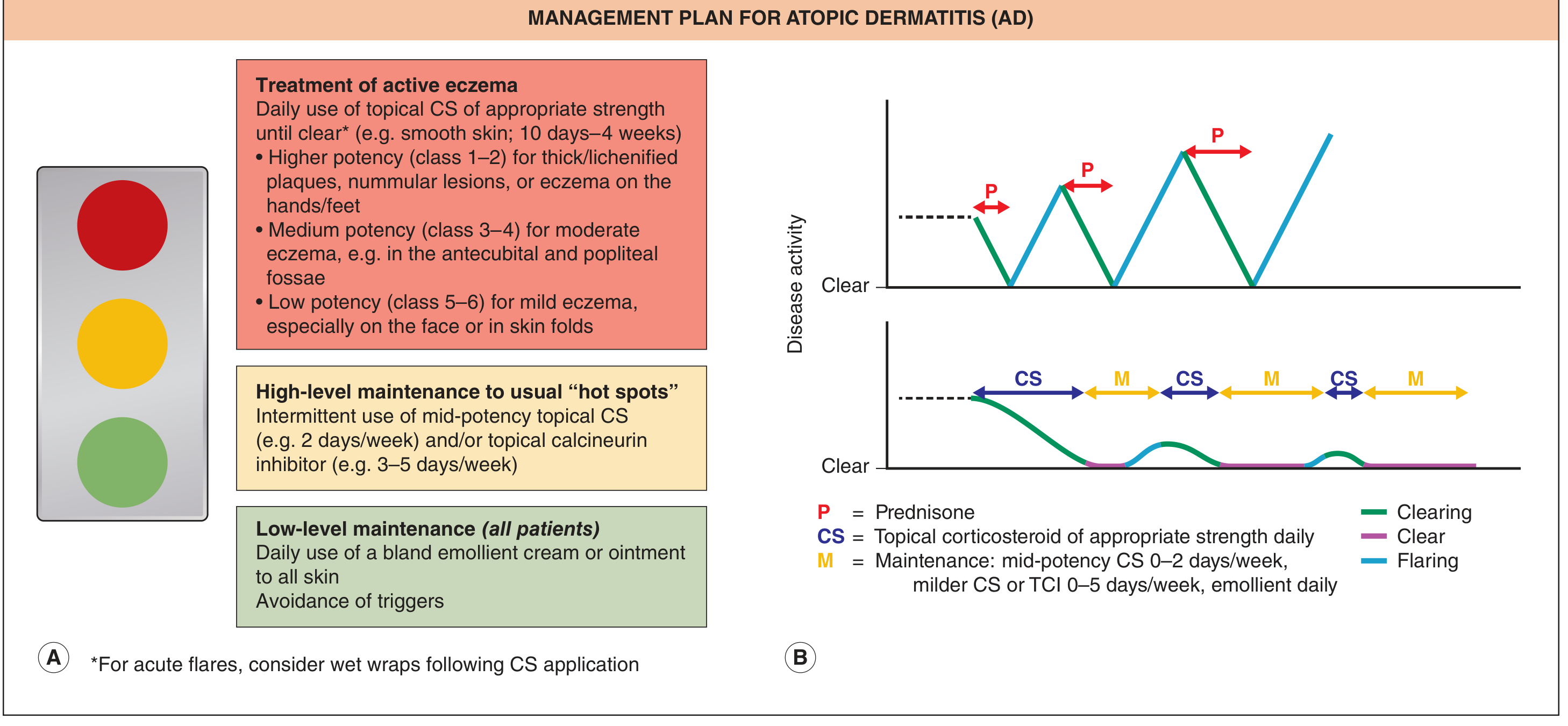 | Red (active disease) | Daily topical corticosteroid (TCS) of appropriate potency until clear (10 days–4 weeks); wet wraps for acute flares |