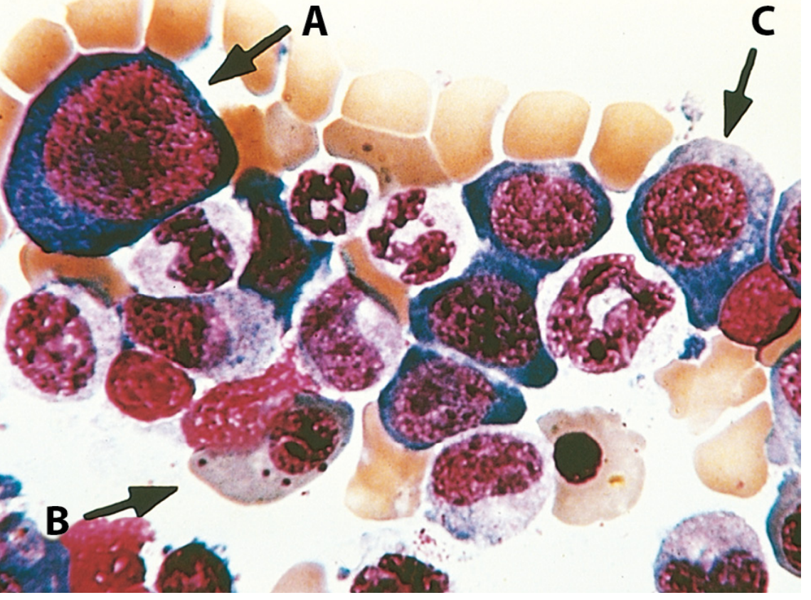 Fig. 14.16 — Megaloblastic anaemia, bone marrow aspirate. A and C are early erythroid precursors with abnormally immature chromatin. B is an orthochromatic megaloblast — haemoglobinised but without the pyknotic nucleus expected of a normal normoblast. (Robbins, p. 609)