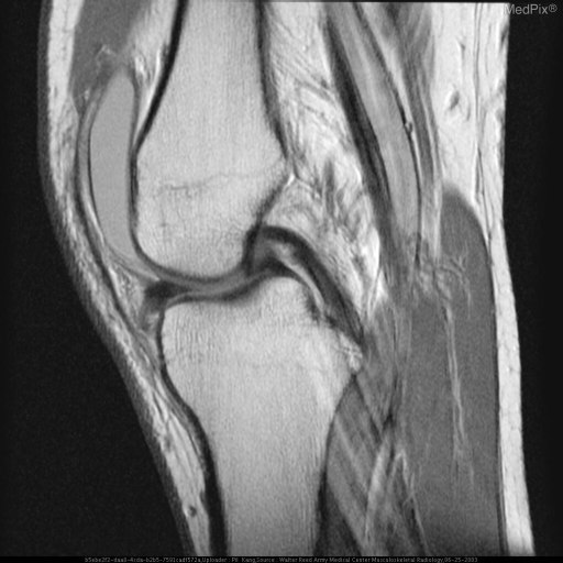 Sagittal MRI demonstrating the normal biconcave, low-signal meniscus positioned between femoral condyle and tibial plateau, with intact cruciate ligaments and infrapatellar fat pad.