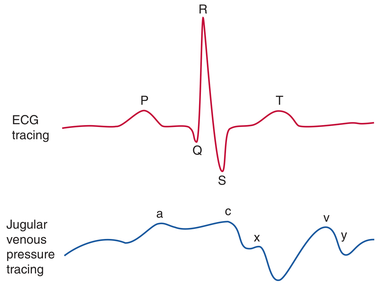 | Tricuspid regurgitation | Tall systolic c-v wave; loss of x descent | Regurgitant RA filling in systole |