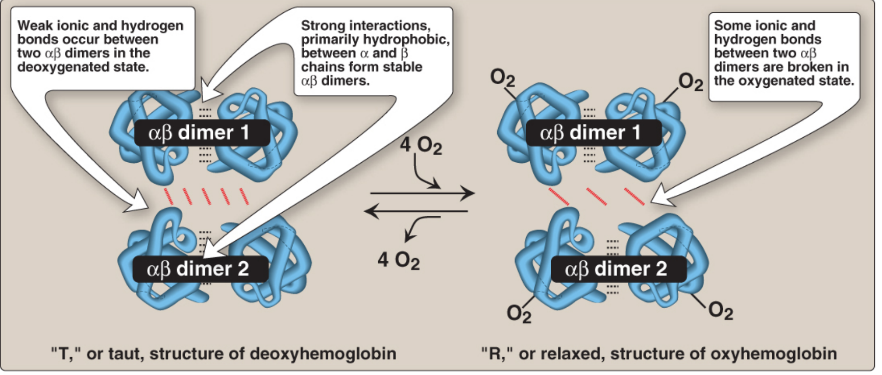 Structural changes on oxygenation/deoxygenation: The T form is stabilised by weak ionic/H-bonds between dimers; the R form results from rupture of these bonds after O₂ binding. — Lippincott's Illustrated Reviews: Biochemistry, 8th ed., p. 95