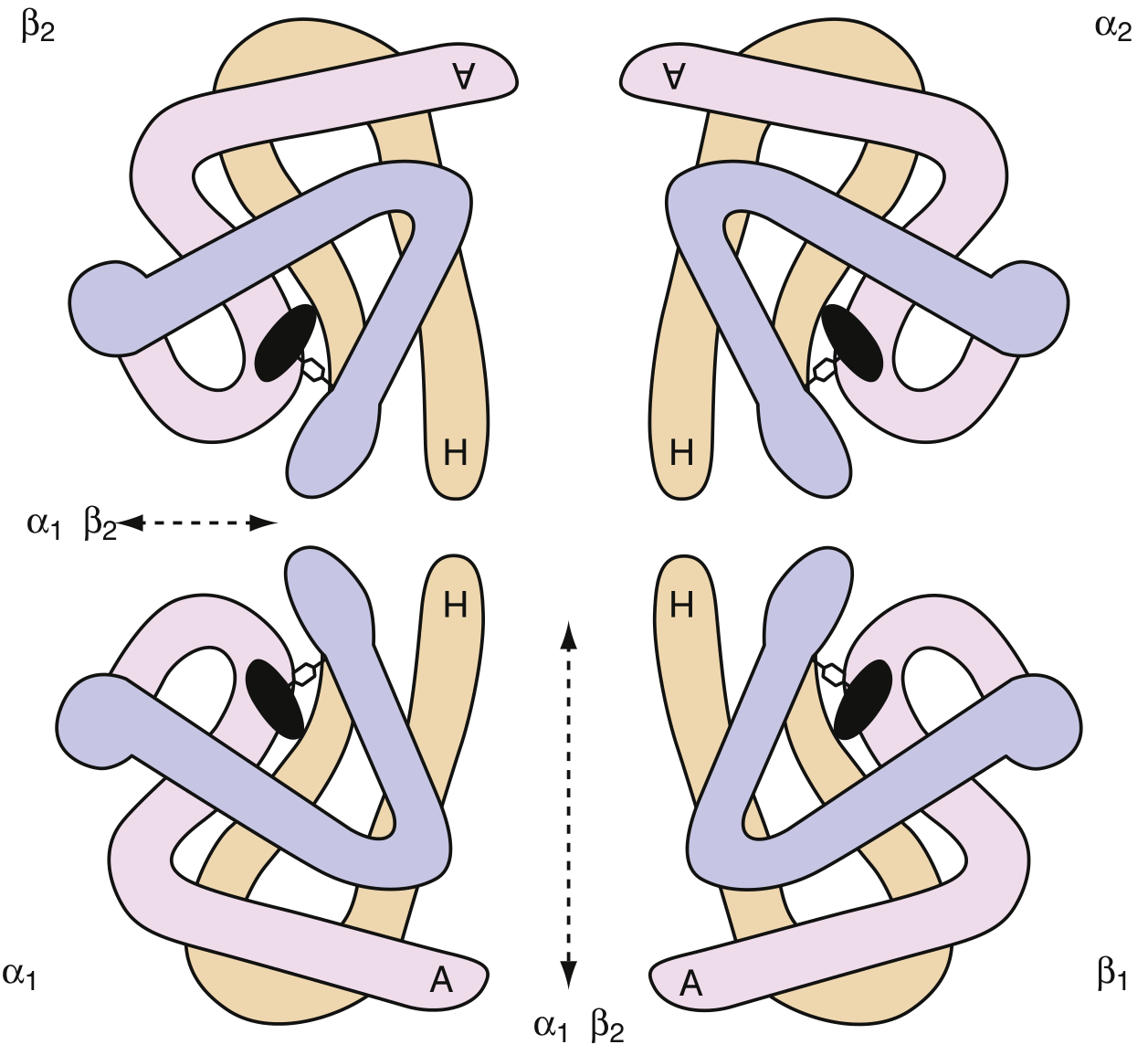 The haemoglobin tetramer (α₁β₁α₂β₂). Each black disk represents a heme group nestled in a hydrophobic pocket of its globin chain. Labels A and H indicate the α-helix segments. — Henry's Clinical Diagnosis and Management by Laboratory Methods, p. 660