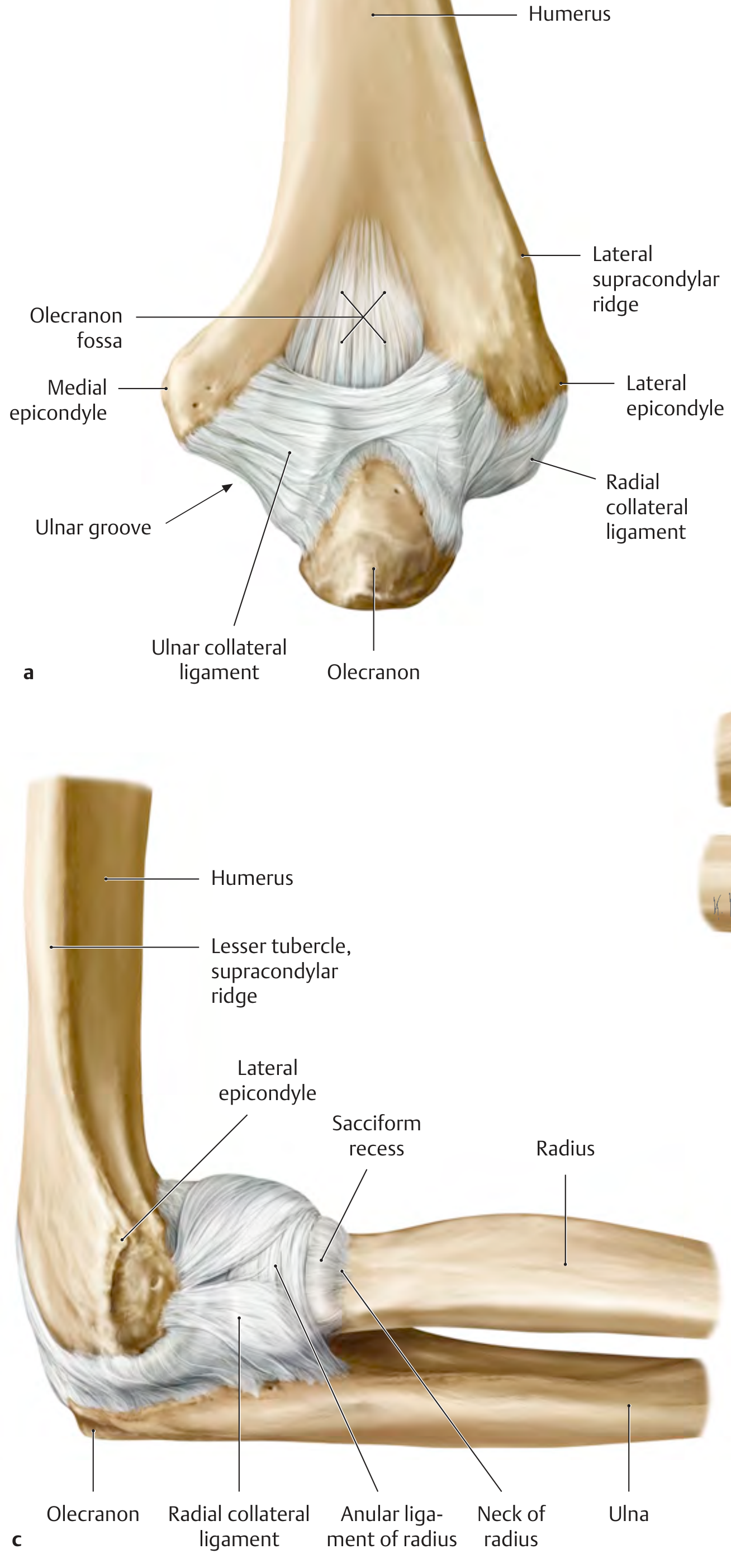 Posterior view (a): ulnar collateral ligament, radial collateral ligament, olecranon fossa, medial and lateral epicondyles. Lateral view (c) with forearm pronated: radial collateral ligament, anular ligament of radius, sacciform recess. — General Anatomy and Musculoskeletal System, THIEME Atlas