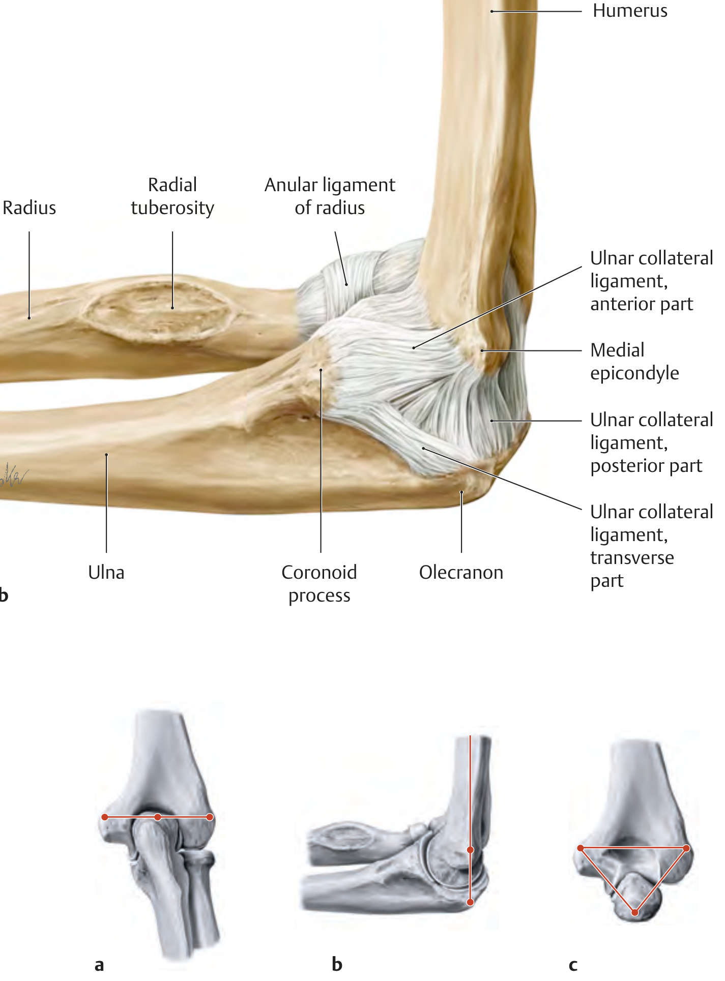 Medial view (b): anterior, posterior, and transverse parts of the ulnar collateral ligament. Anular ligament of radius and coronoid process labeled. Also: Hueter's line (a, extension) and Hueter's triangle (c, flexion posterior view). — THIEME Atlas of Anatomy