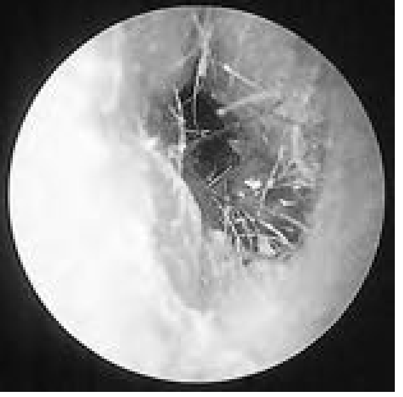 Otomycosis with Aspergillus flavus: tufts of fungus crowned by white conidiophores — Cummings Otolaryngology, Fig. 138.2