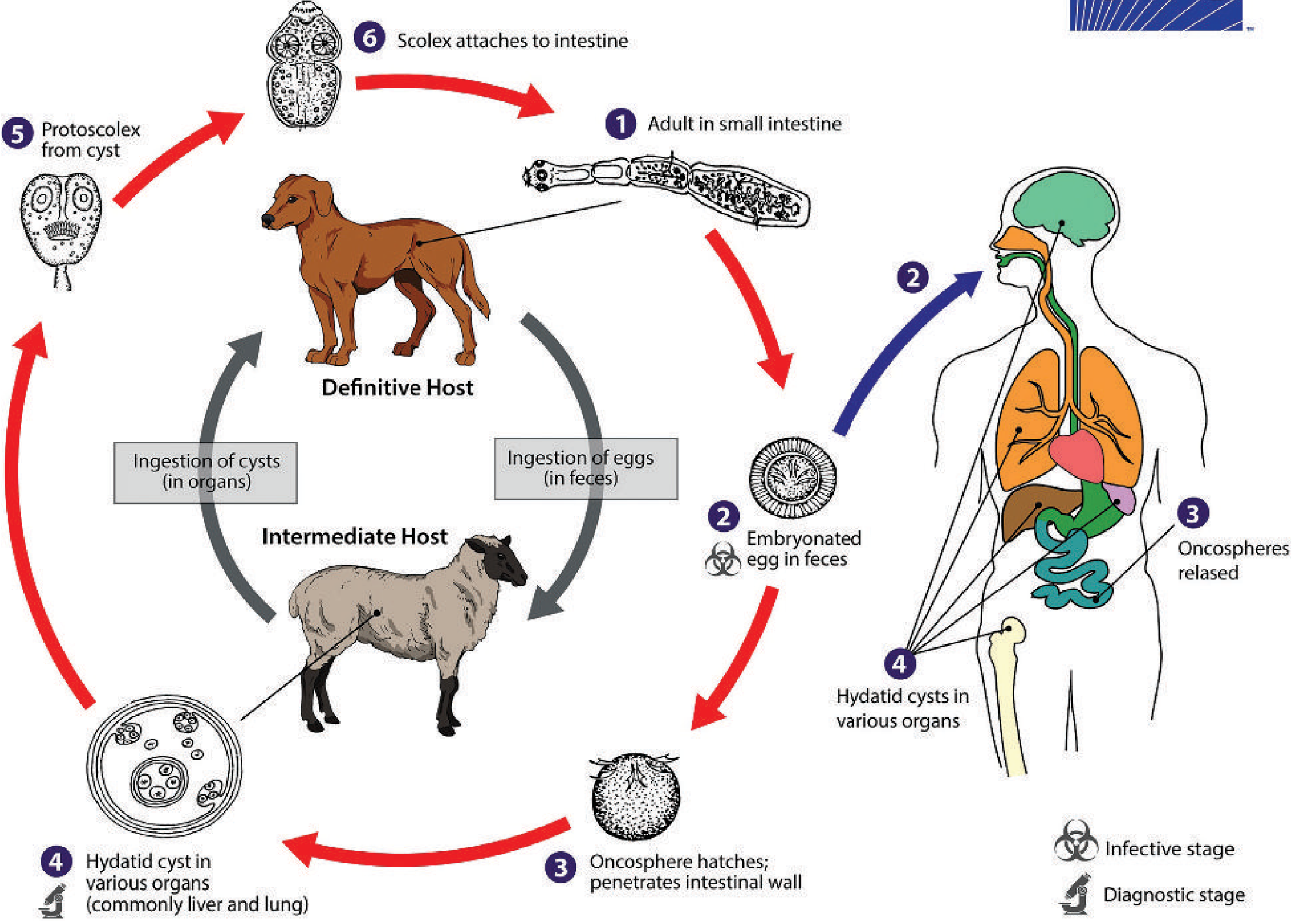 - Canid re-infection: Dog ingests cyst-containing viscera → protoscoleces released → mature into adult worms in intestine → cycle repeats.