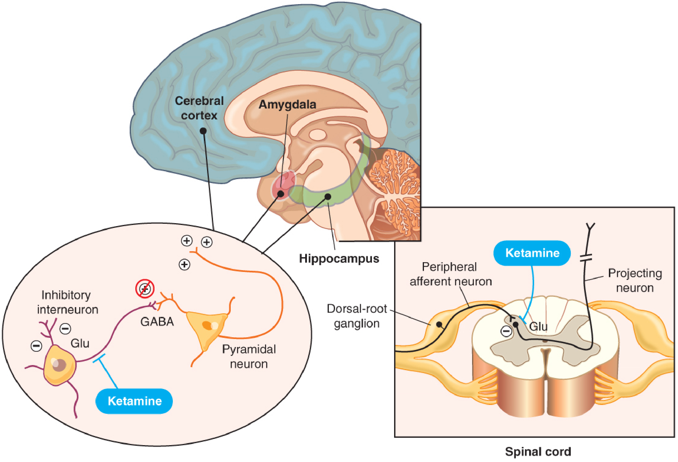 Ketamine preferentially binds NMDA receptors on inhibitory interneurons in the cortex, amygdala, and hippocampus, producing disinhibition. In the spinal cord, it blocks NMDA glutamate-mediated nociceptive signals from peripheral afferent neurons. — Barash Clinical Anesthesia, 9e