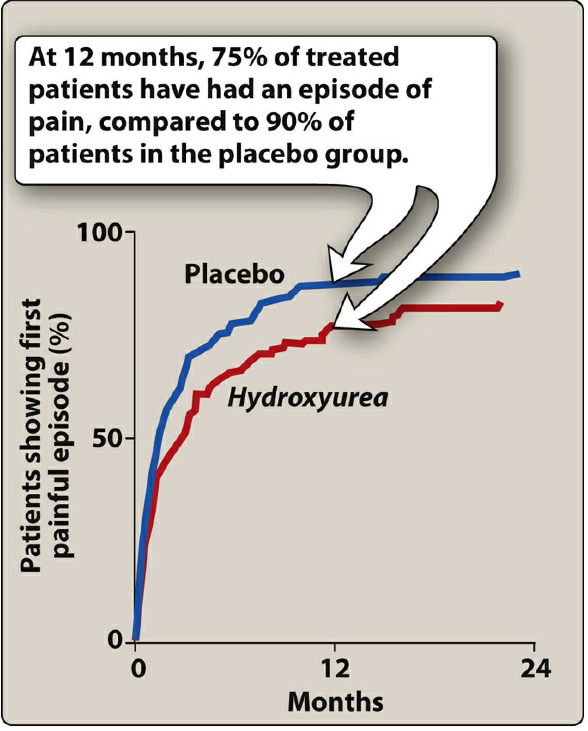 Efficacy: At 12 months, only 75% of treated patients had a painful episode vs. 90% in the placebo group (see graph below).