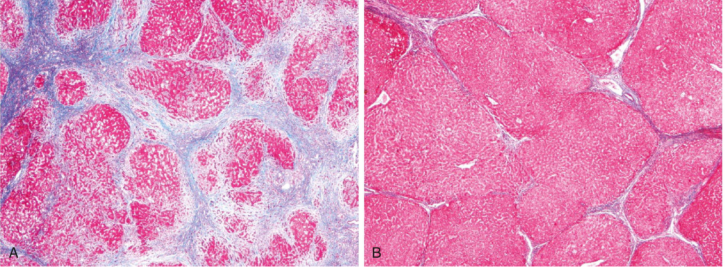 Alcohol-related cirrhosis: active disease (A) and after long-term abstinence (B). — Robbins & Kumar Basic Pathology, p. 599