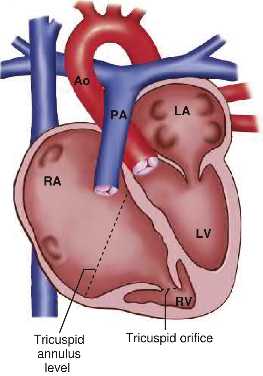 - Apical/anterior displacement of the functional tricuspid annulus