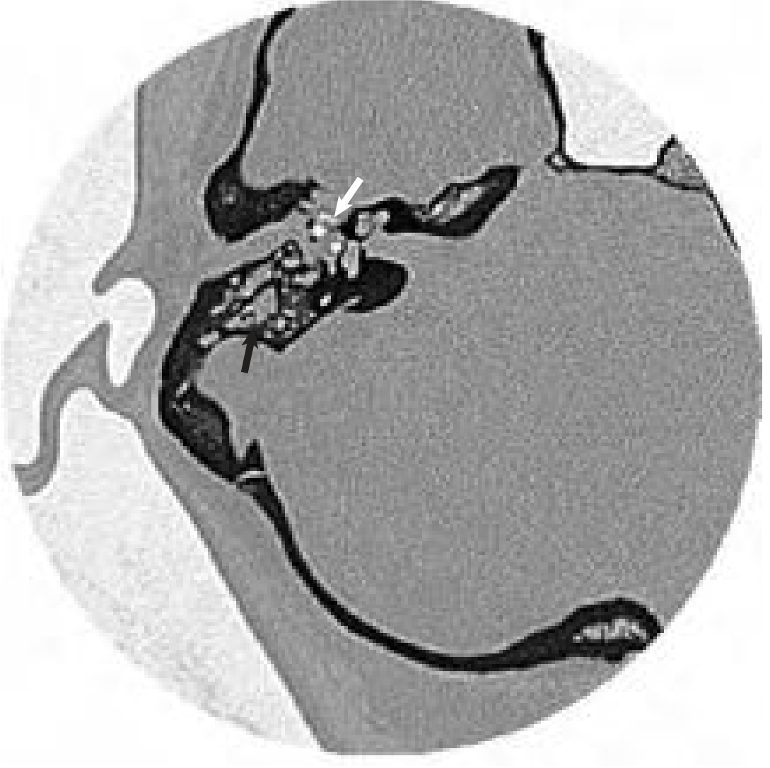 Fig. 141.3 CT scan: opacification of middle ear (white arrow) and mastoid (black arrow). — Cummings Otolaryngology