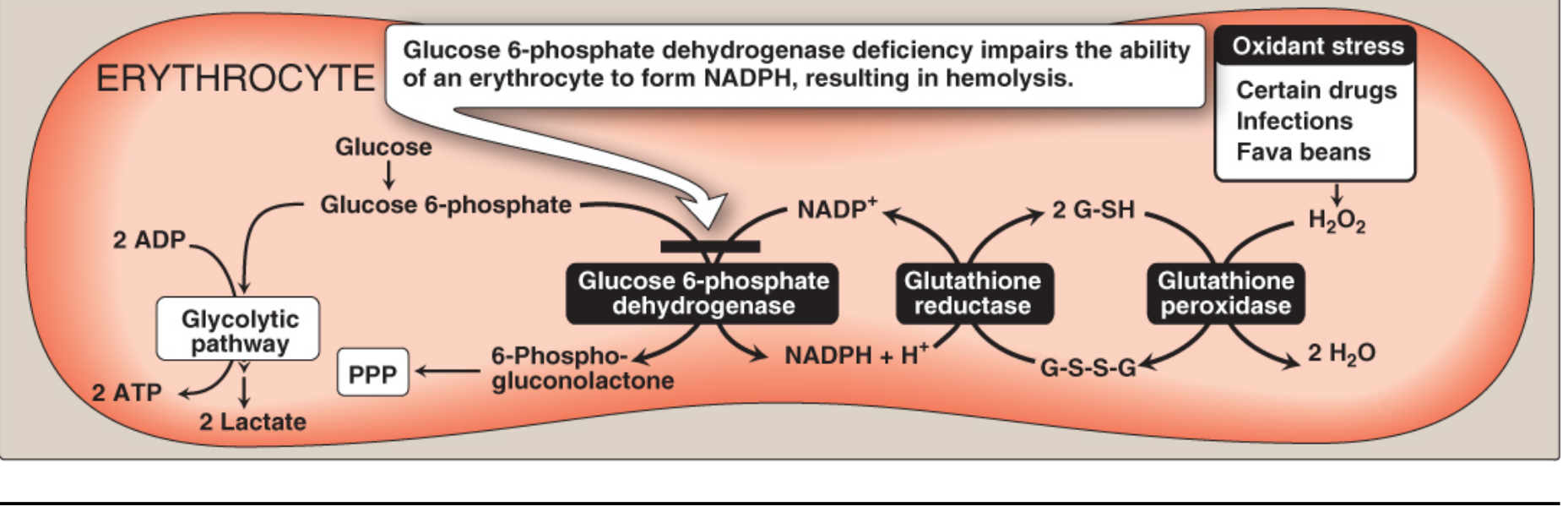 | 2 | G6PD is deficient → NADPH cannot be regenerated |