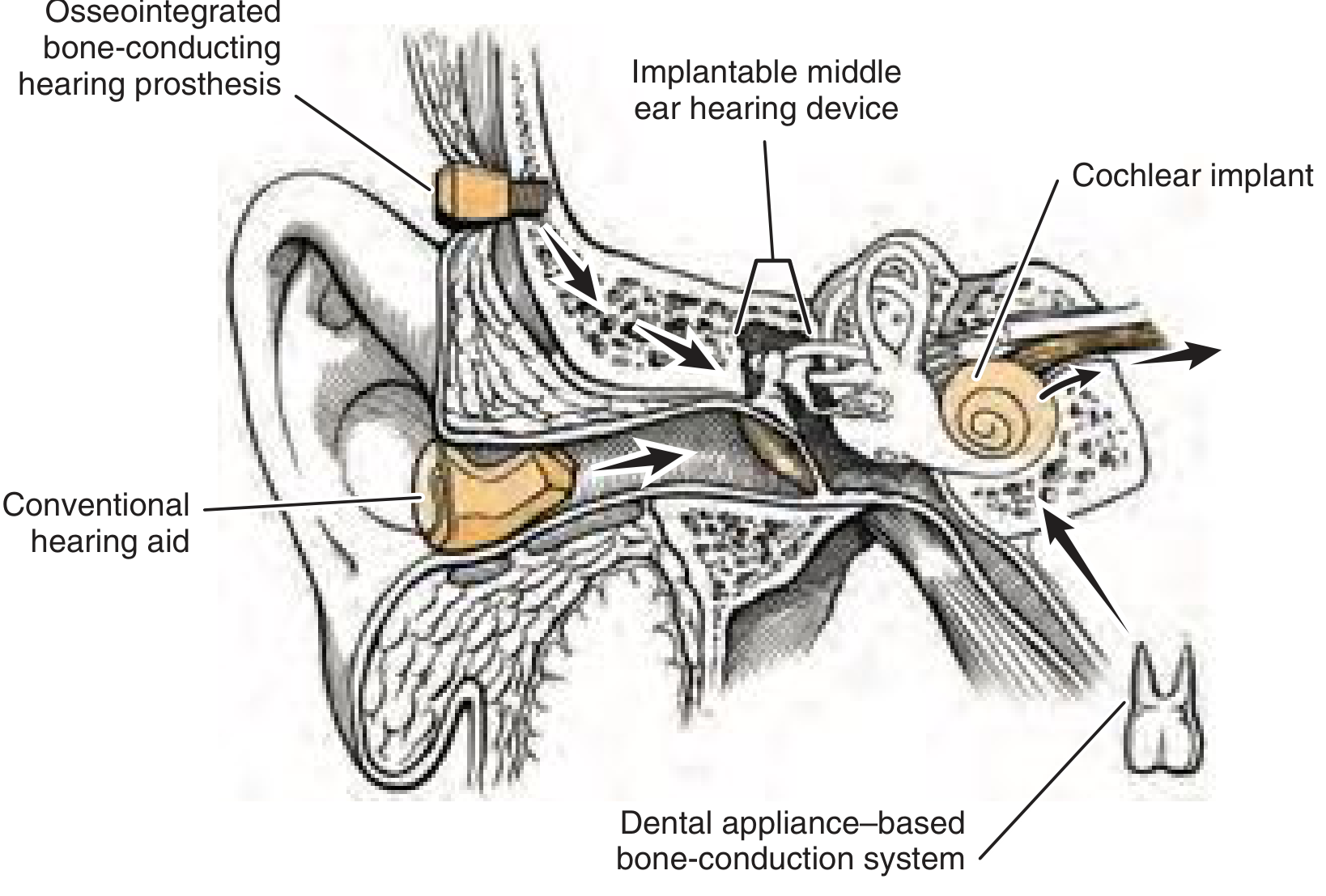 Fig. 159.1 — Osseointegrated bone-conducting hearing prostheses are applied to the retroauricular skull to provide hearing via bone conduction, bypassing the external and middle ear entirely.