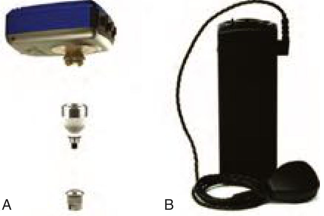 Fig. 159.10 — (A) Baha 4 Connect System with abutment and titanium screw implant. (B) Cordelle II device for patients with greater sensorineural component, offering increased amplification.