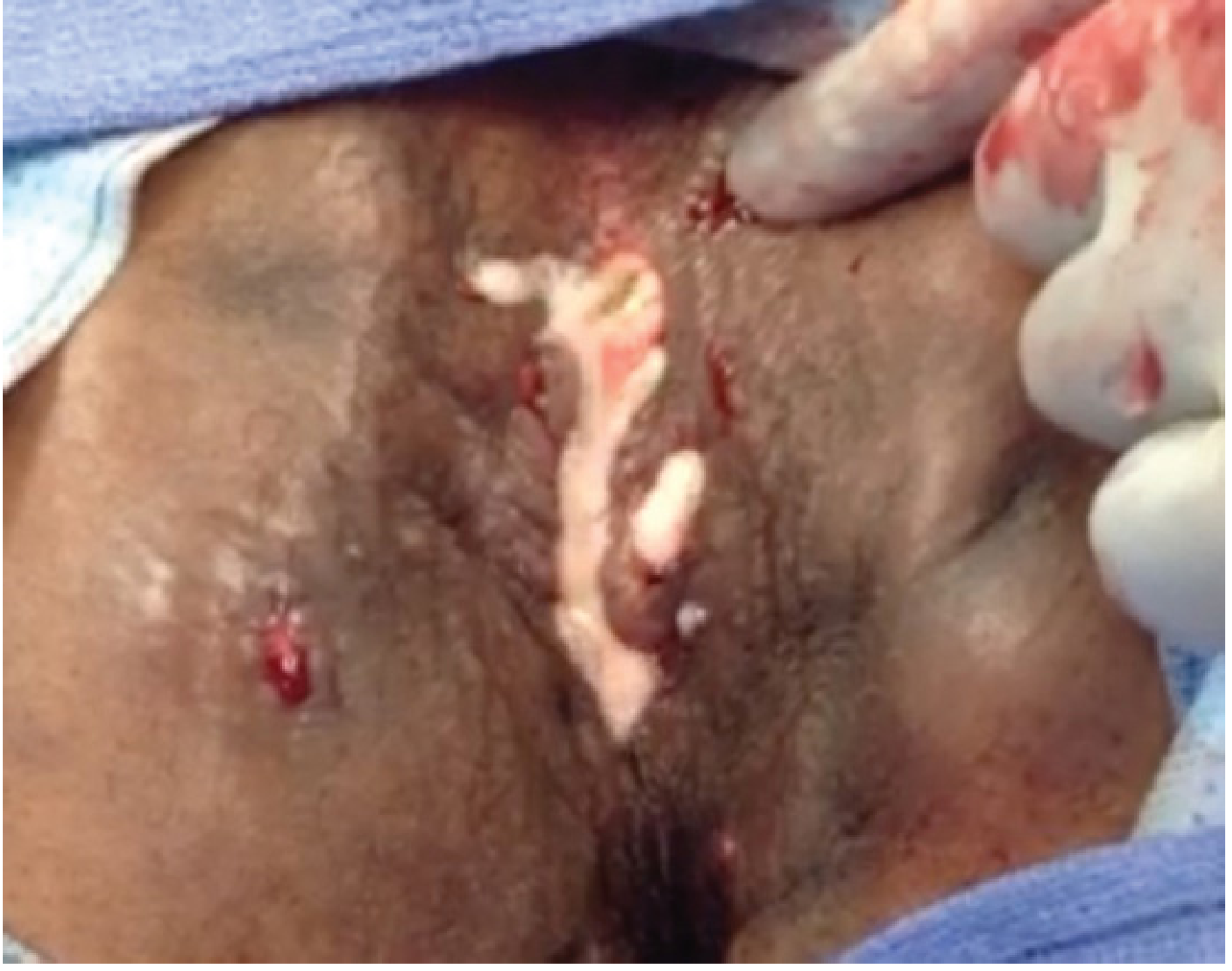 - Crohn's perianal disease: Multiple external openings, skin discoloration, hardened scarring over scrotum and perianal skin