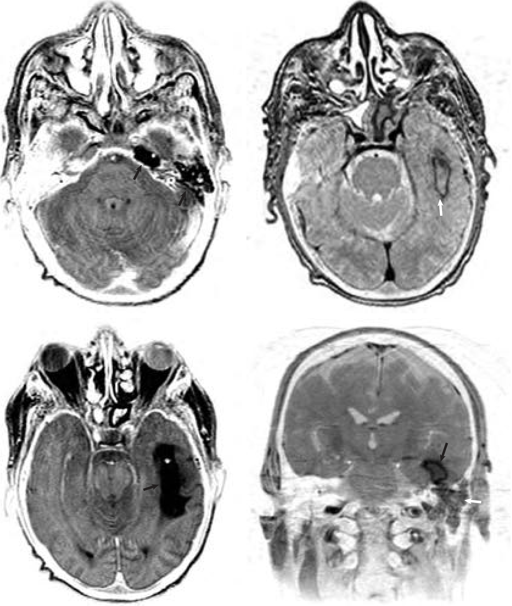 CT: absent enhancement of left sigmoid sinus with opacified mastoid (white arrow); absent flow in left internal jugular vein (black arrow).