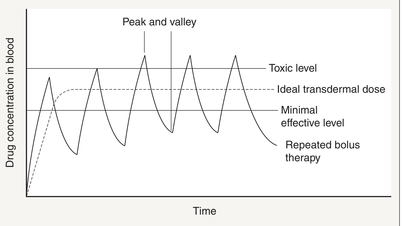 - Onset of action is slower than oral or IV routes due to diffusion lag time through skin