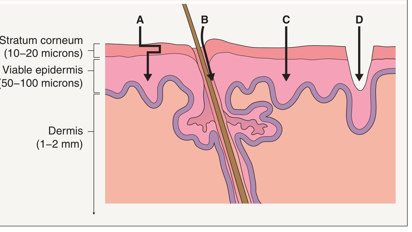| A — Intercellular (tortuous lipid) | Winding path through extracellular lipids of the stratum corneum; used by most passive and chemical-enhancer methods |