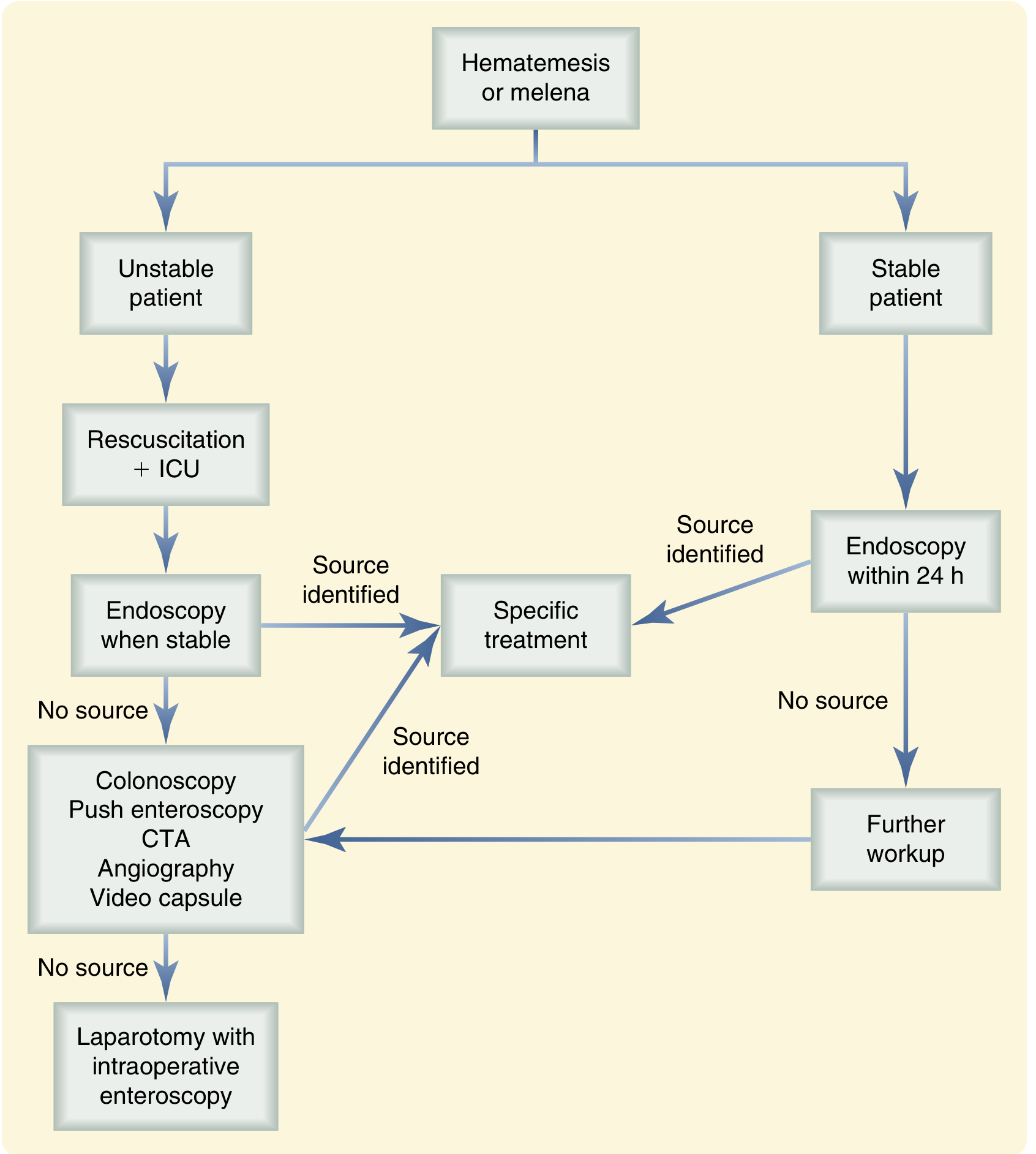 Diagnostic and management algorithm for hematemesis or melena — Sabiston Textbook of Surgery