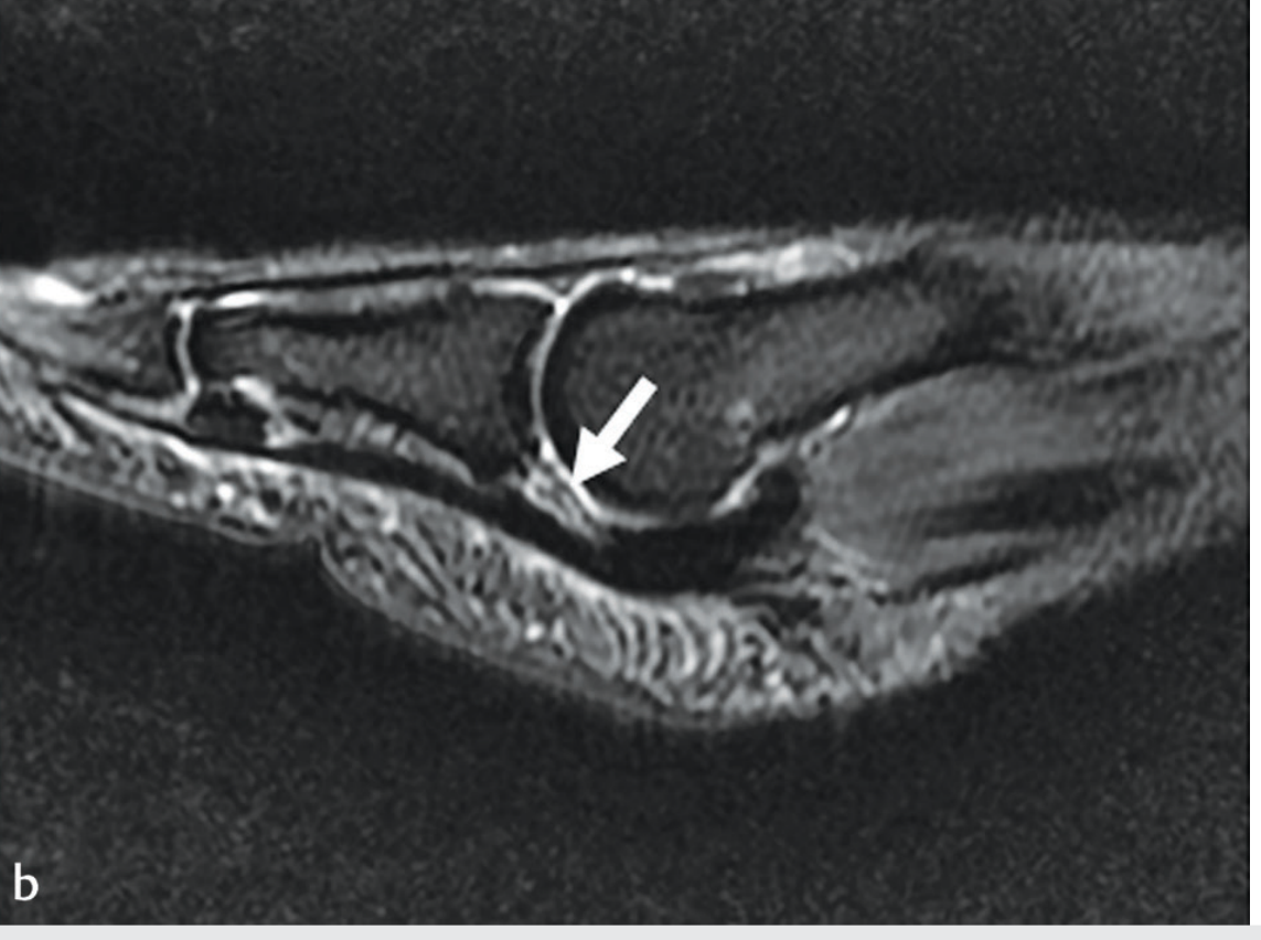 Sagittal MRI showing increased signal at the distal plantar plate (arrow) consistent with tear; the plate is displaced proximally — Imaging Anatomy: Bones, Joints, Vessels & Nerves