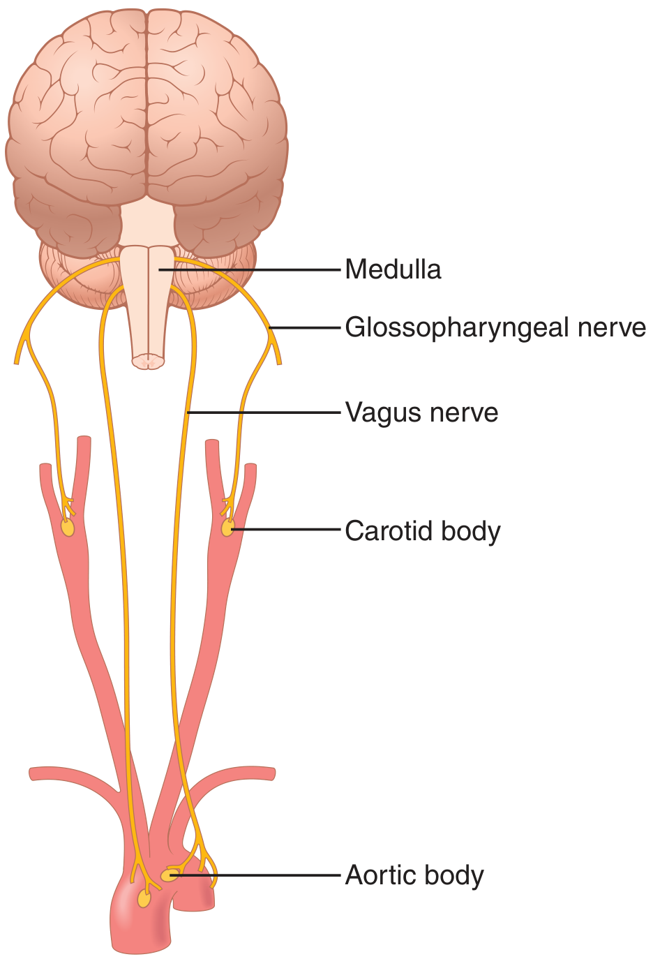 Located in the carotid bodies (at carotid bifurcations, signaling via CN IX) and aortic bodies (along aortic arch, signaling via CN X vagus).