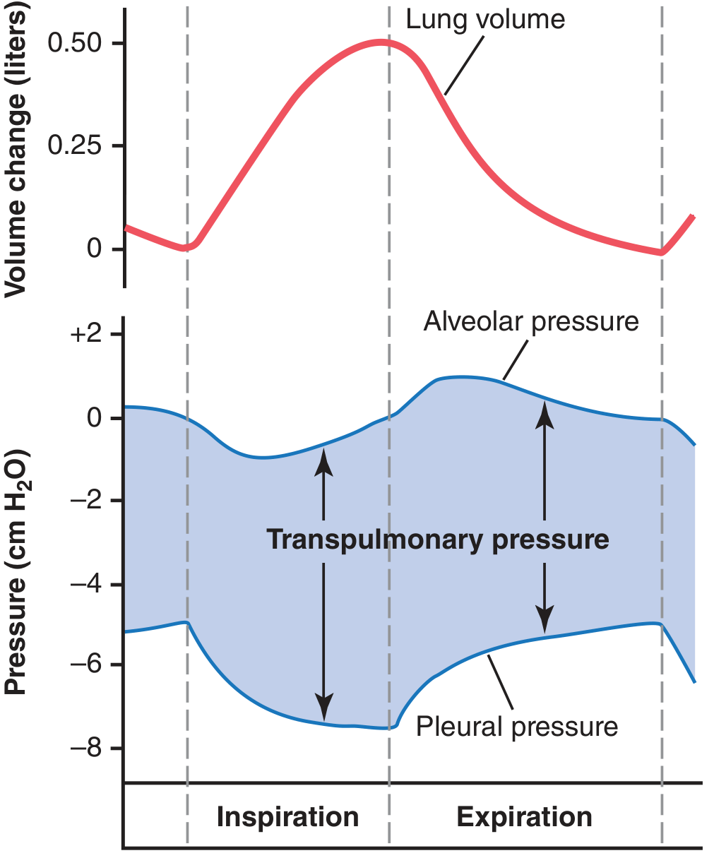 - Alveolar pressure must drop below atmospheric (−1 cm H₂O) to draw 0.5 L of air in during quiet inspiration; it rises to +1 cm H₂O during expiration to push air out.